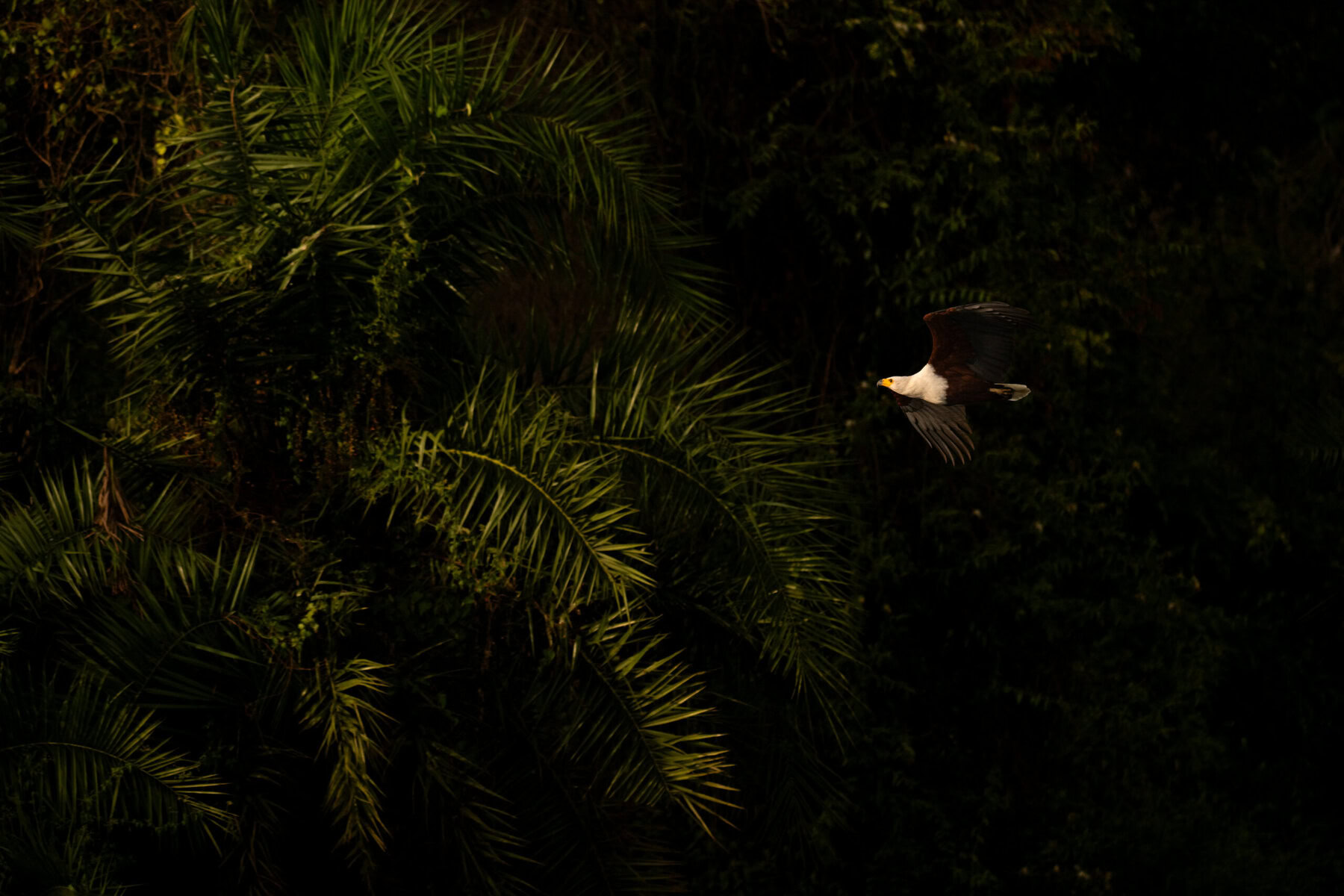 En fin de journée, un aigle pêcheur d’Afrique survole le canal de Kazinga, dans le parc national de Queen Elizabeth. À cette heure où la lumière décline, les rapaces s’activent au-dessus de l’eau, scrutant la surface à la recherche de poissons.