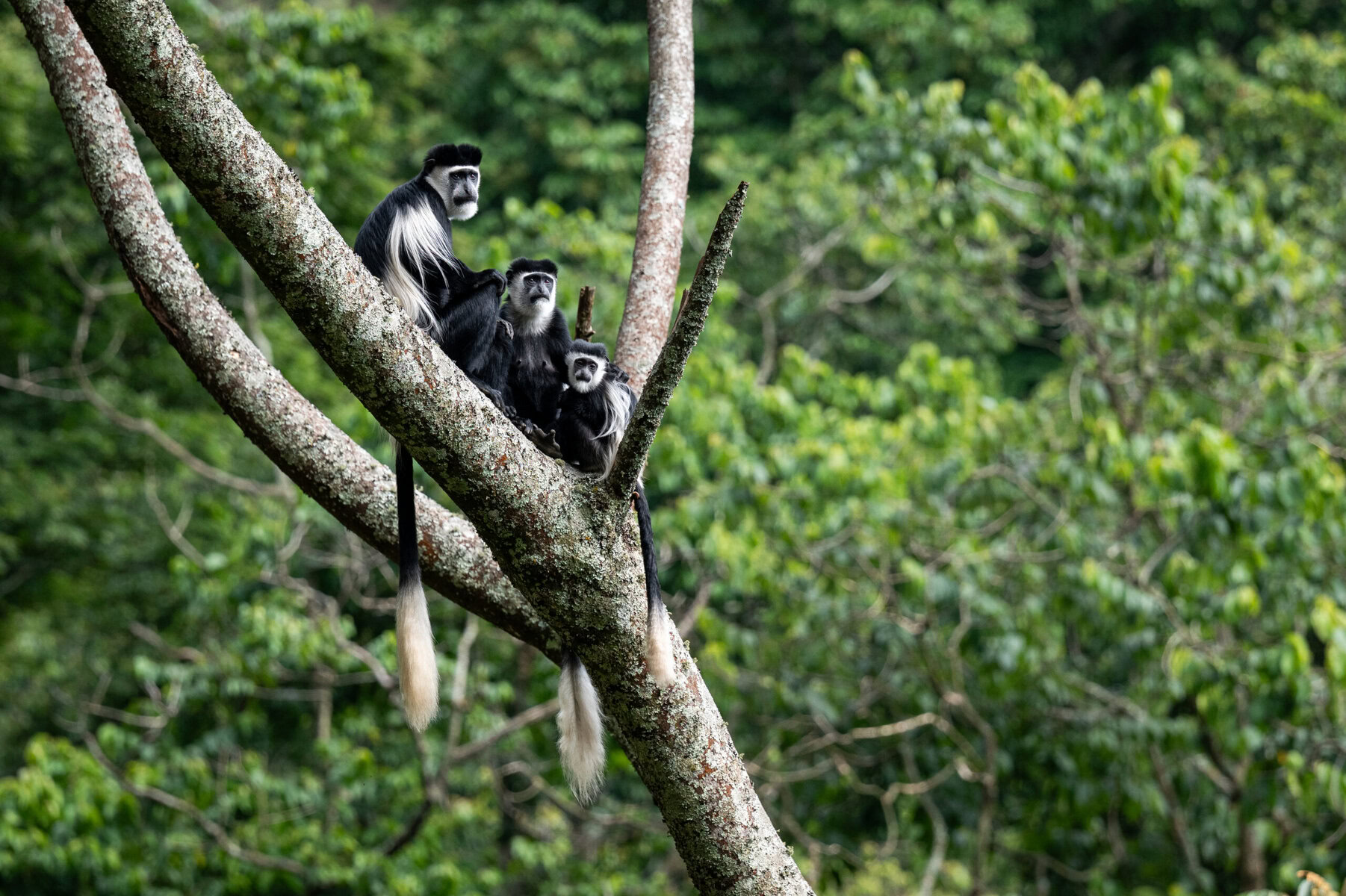 Photographiée depuis la route qui traverse le parc national de Bwindi, cette scène rappelle que la forêt ne se limite pas aux gorilles emblématiques. Elle abrite une diversité remarquable de primates, dont ces colobes à l’allure presque graphique.