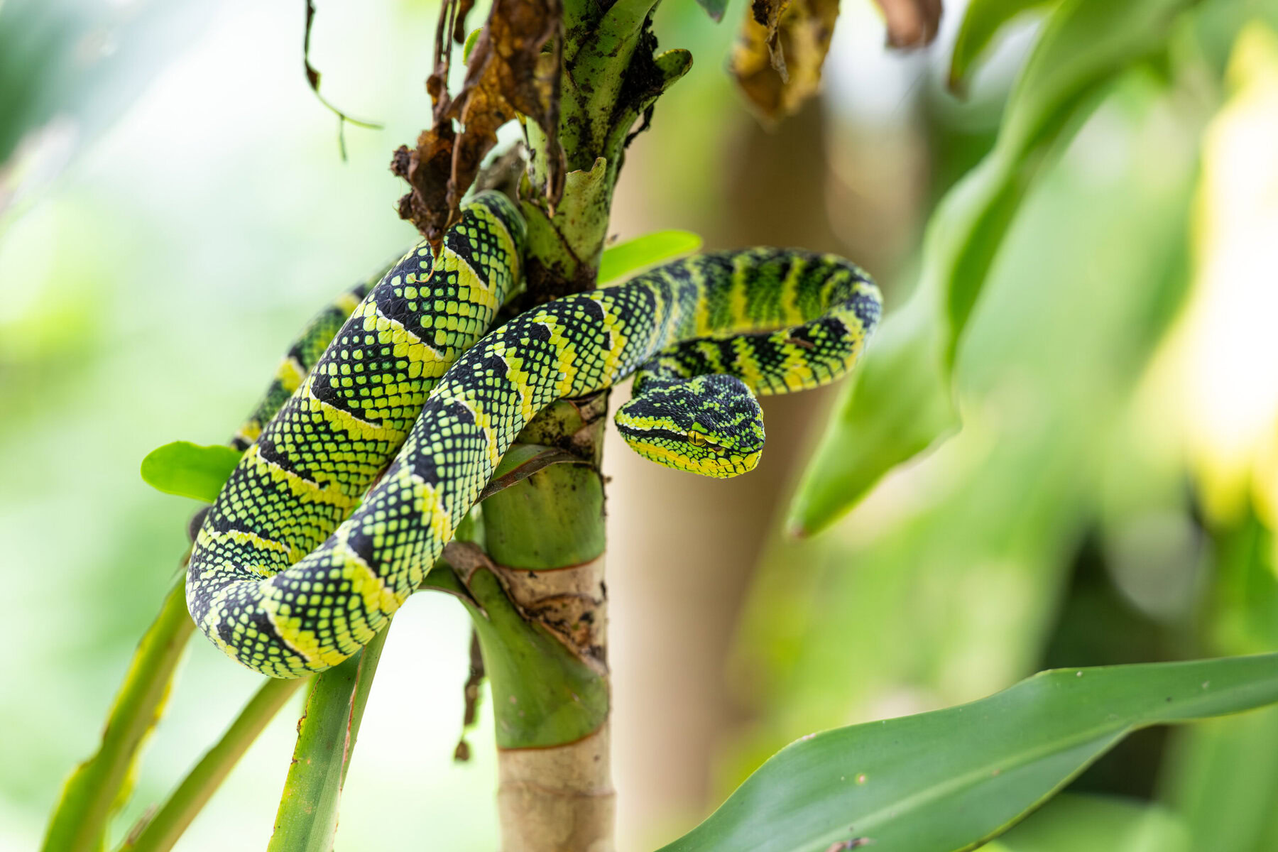 Cette vipère des temples, photographiée en Indonésie, évolue au cœur de la jungle tropicale, parfaitement dissimulée dans la végétation. Ses couleurs vives mêlant vert, jaune et noir attirent immédiatement le regard, tout en jouant un rôle essentiel de camouflage et d’avertissement.
