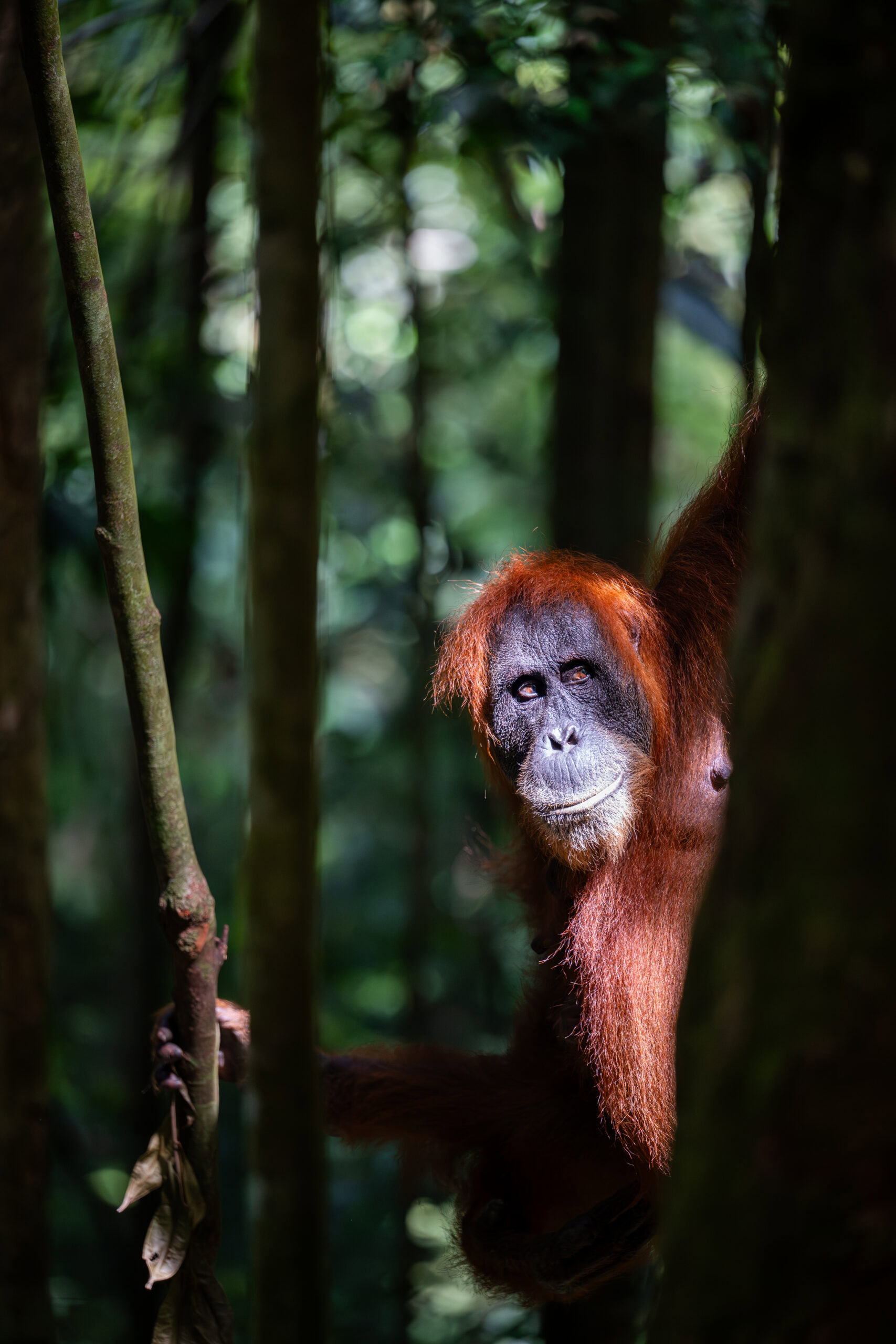 Cet orang-outan de Sumatra a été photographié dans la pénombre de la jungle du parc national de Gunung Leuser, en Indonésie. Partiellement dissimulée derrière les troncs, cette femelle apparaît dans un jeu subtil d’ombre et de lumière, révélant toute la profondeur de son regard.