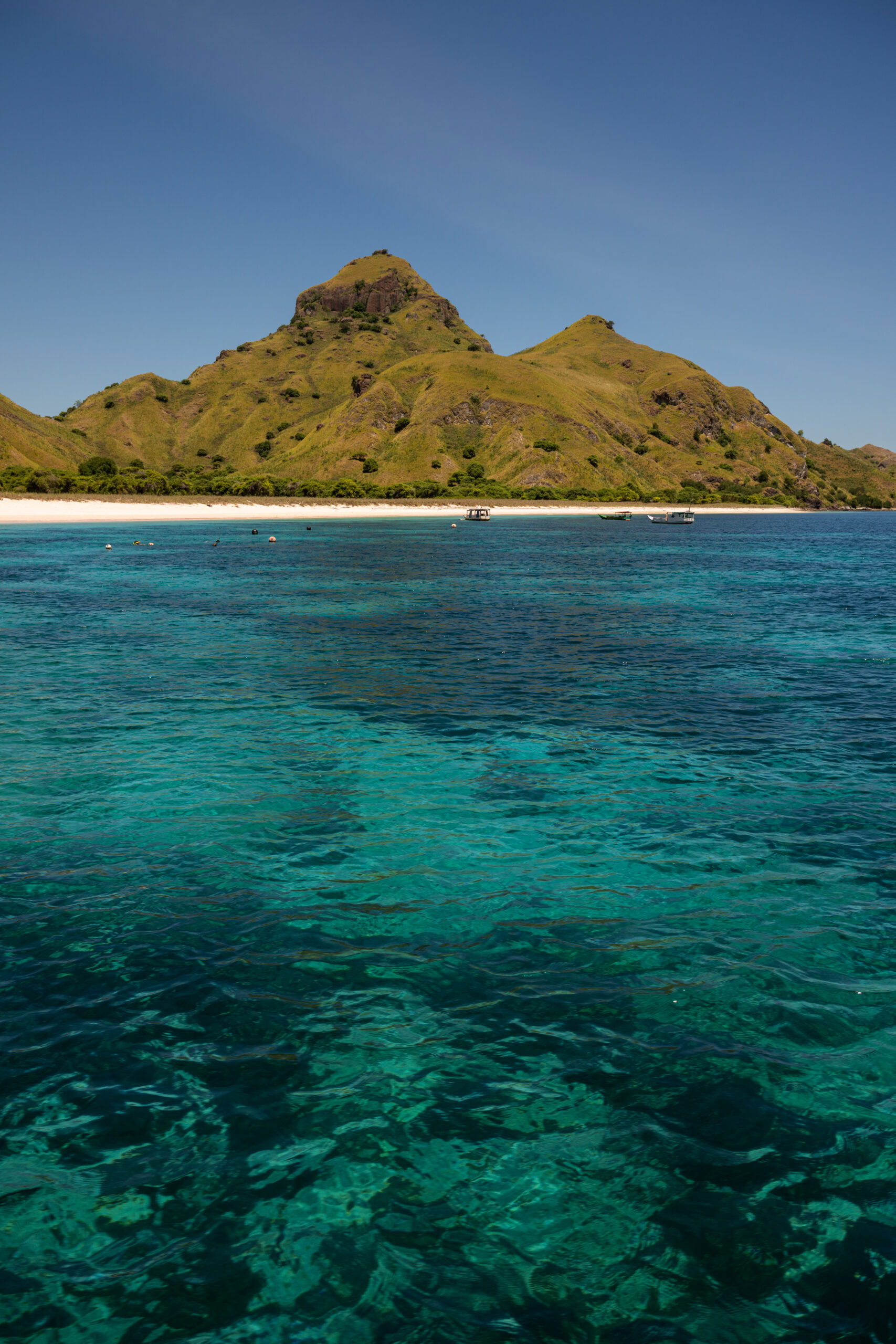 Face à cette eau aux nuances turquoise et émeraude, les reliefs arides des îles de Komodo contrastent avec la douceur du lagon. Cette dualité entre terre sèche et mer foisonnante est caractéristique de cet écosystème unique, situé au cœur du triangle de corail.