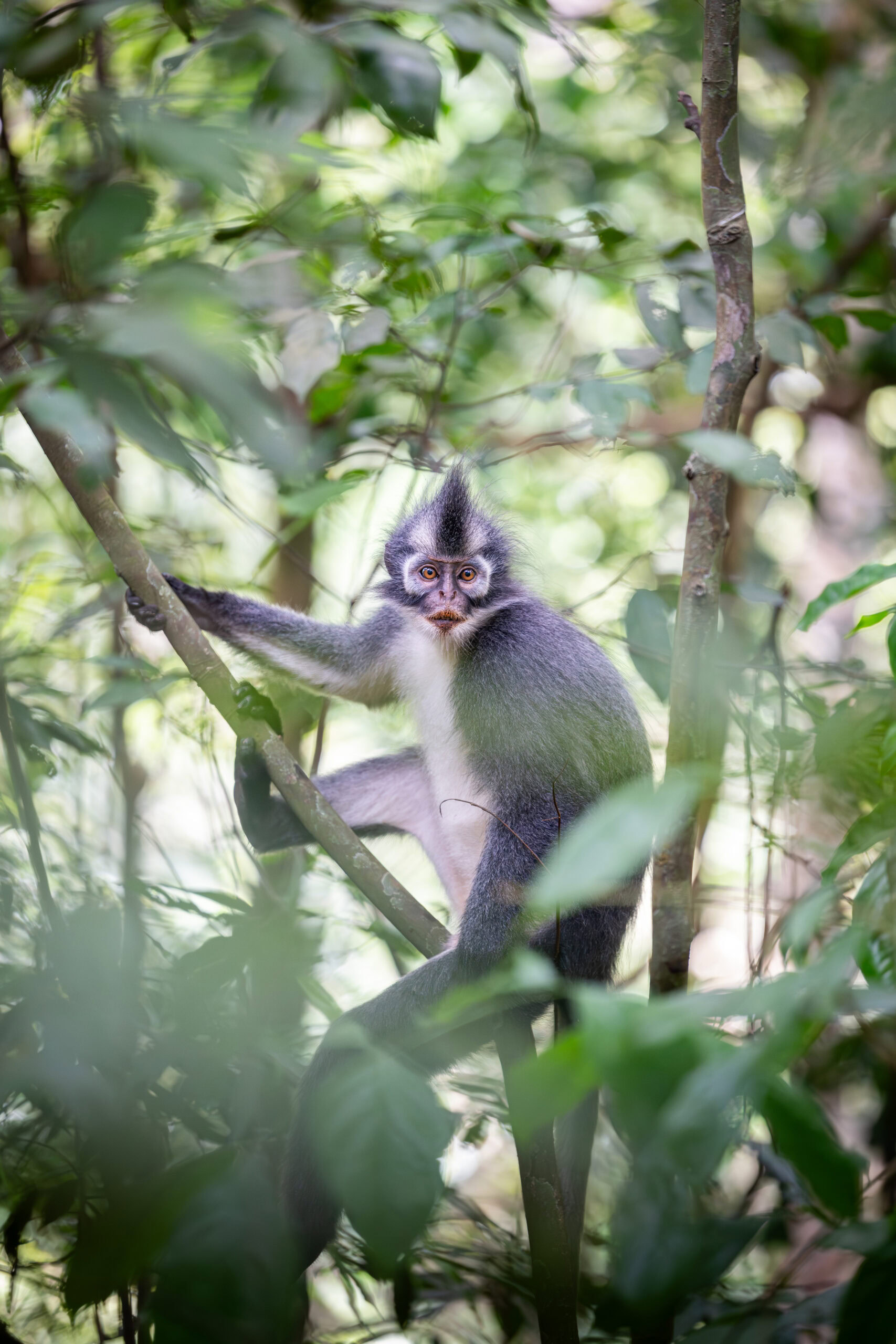 Ce semnopithèque de Thomas (Thomas’s leaf monkey), espèce endémique du nord de Sumatra, évolue dans la canopée dense de la jungle de Bukit Lawang, au cœur du parc national de Gunung Leuser en Indonésie. Reconnaissable à sa crête caractéristique et à son regard expressif, ce primate arboricole passe l’essentiel de son temps dans les arbres, où il se nourrit principalement de feuilles, de fruits et de jeunes pousses.