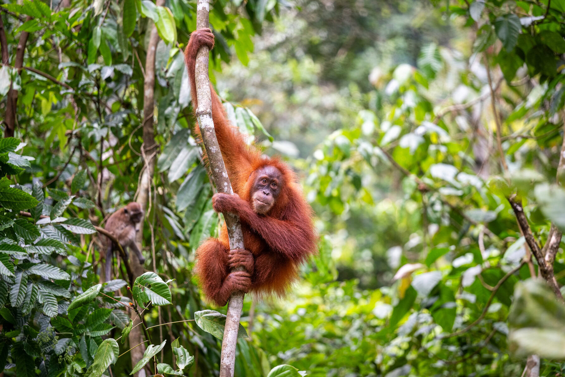Ce jeune orang-outan de Sumatra, photographié dans la jungle du parc national de Gunung Leuser près de Bukit Lawang, évolue avec agilité au cœur de la canopée tropicale. Accroché à un tronc fin, il illustre parfaitement les capacités exceptionnelles de ces grands primates arboricoles, capables de se déplacer avec une étonnante fluidité entre les arbres.