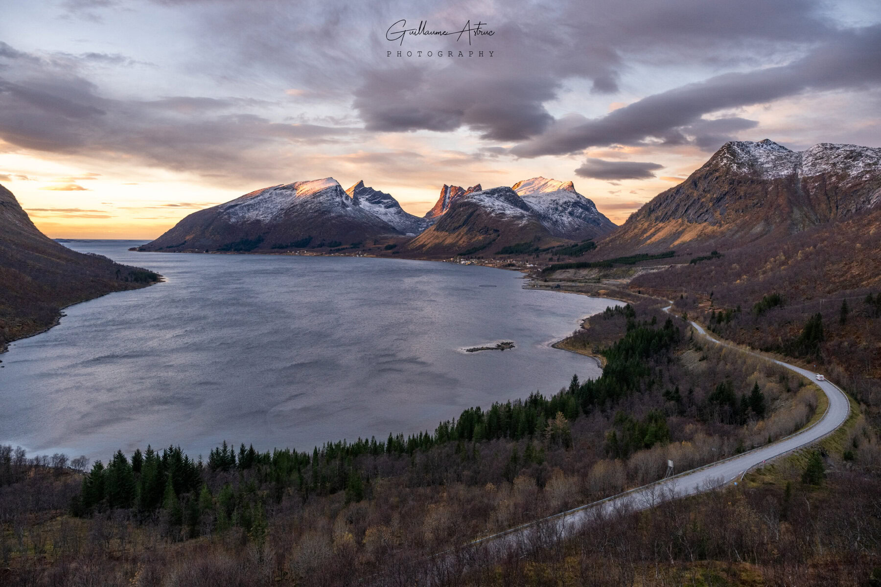 Une route serpente le long d’un fjord paisible, guidée par la lumière déclinante du Nord.